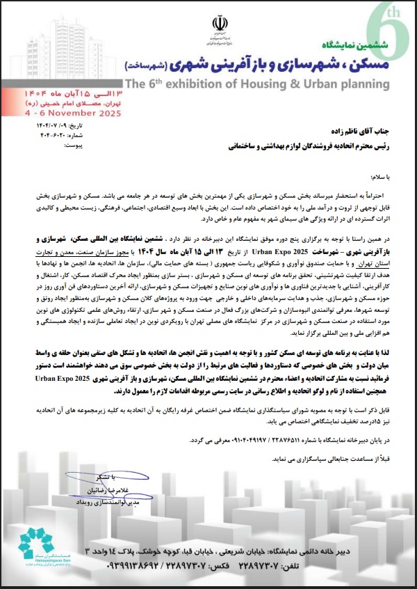 با توجه به برگزاری ششمین نمایشگاه مسکن شهرسازی و بازآفرینی شهری (شهرساخت) از 13 تا 15 آبانماه 1404 در محل مصلی تهران از اتحادیه فروشندگان و تولیدکنندگان لوازم بهداشتی تهران و اعضاء محترم اتحادیه دعوت می شود تا جهت شرکت در این نمایشگاه با شماره 02122876511 – 09104049197 هماهنگی های لازم را بعمل آورند